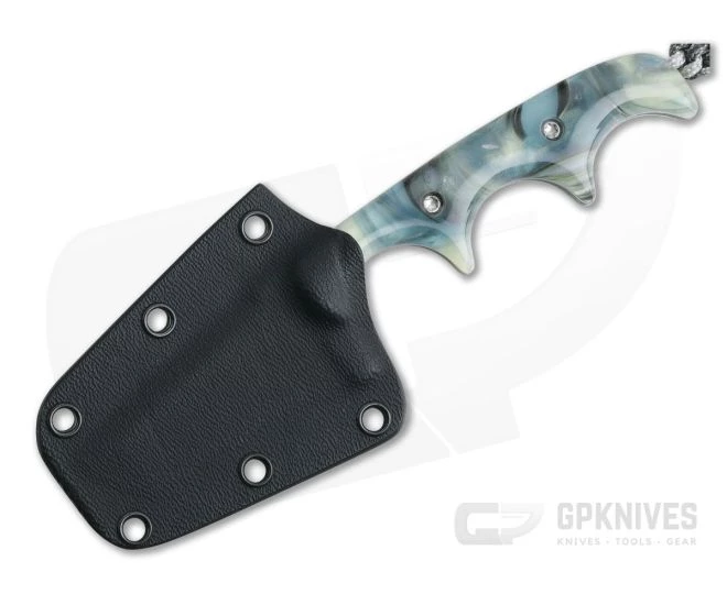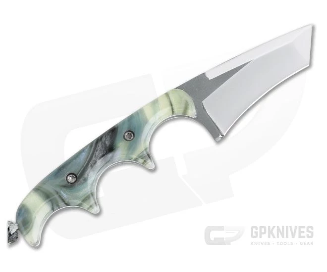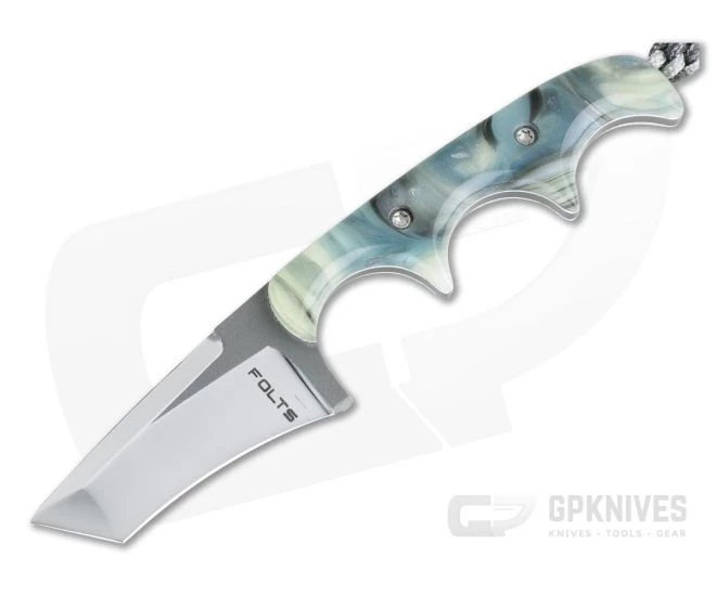 Alan Folts Custom Minimalist Tanto is a small everyday carry fixed blade made to be minimal in size (hence the name) while offering maximum function. The lightweight, well-balanced design doesn’t take up much space making it a perfect choice for discreet every day carry. This version comes with a polished two-tone, CPM-154 Tanto blade and “Ocean” Custom Acrylic handles.
