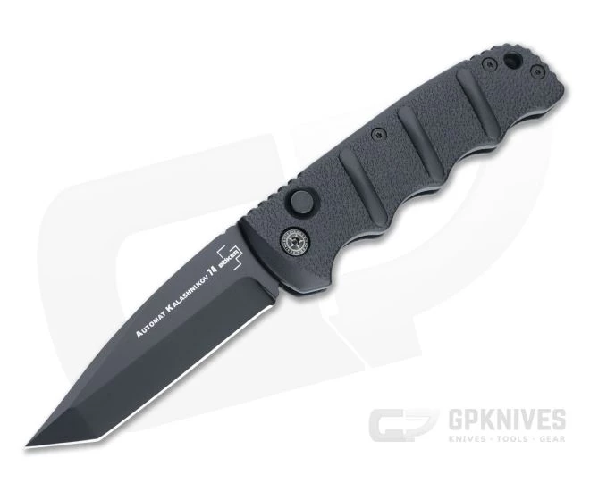 The Boker Kalashnikov 74 automatic is a full size budget friendly option as an entry into the world of automatic knives and a solid choice for EDC weighing in at under 4 ounces! The Tanto blade deploys fast and smooth via the button lock mechanism and the grooved aluminum handles provide comfort and security. This version comes with a black coated D2 tool steel Tanto blade and matching aluminum handles.