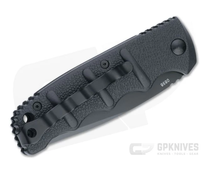 Handle: The black aluminum handles are tough, lightweight, and feature finger groves that lock the knife securely in the hand. The handles have a random texture and contoured traction bumps that work in conjunction with the finger grooves delivering a solid four finger grip. The button lock mechanism is smooth, solid, and reliable for safe operation.