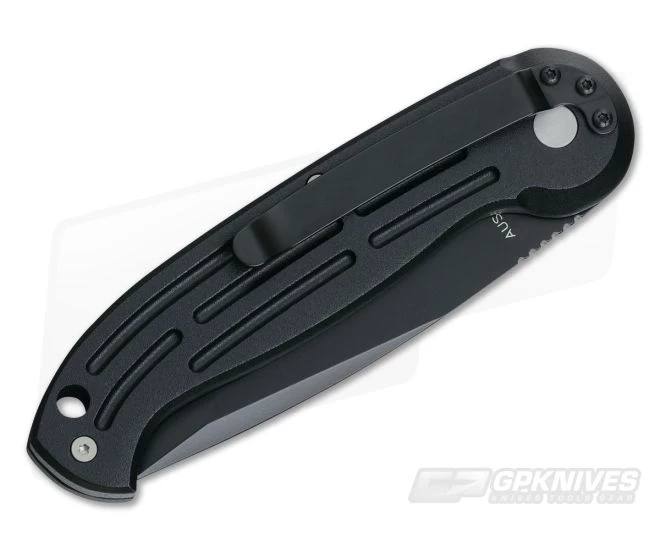 The Blade:Â A saber ground Tanto blade comes in AUS-8 for easy sharpening to a razor like edge. It offers good corrosion resistance which is enhanced further with the discreet black coating. The plain edge front is great for slicing while the serrated edge in back offers aggressive cutting against fibrous materials.