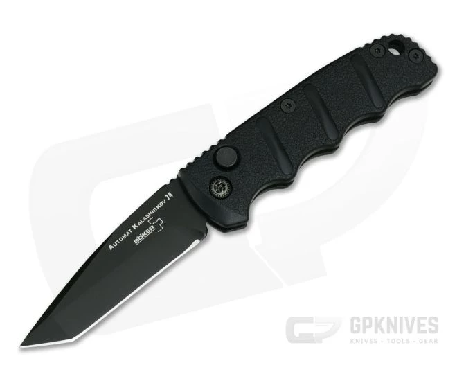 The Boker Kalashnikov 73 automatic is the Mini version of the popular Kalashnikov 74. This is another great budget friendly option as an entry into the world of automatic knives and a solid choice for a lightweight EDC weighing in right at 2 ounces! The saber ground Tanto blade deploys fast and smooth via the button lock operation and the aluminum handles are grooved for comfort and security.Â