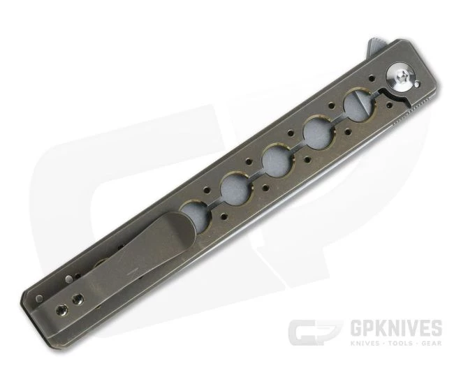 Handle:Â Two solid titanium slabs form the base of this minimalist yet robust folder with the open back construction achieved with two anodized barrel spacers and the blade pivot. Both slabs are bronze anodized and chamfered for comfort with milled holes for traction and weight reduction with the Slim variant coming in at about 20% smaller in the width for an even better carry profile. The back slab forms the frame lock mechanism which is reliable and easy to operate with titanium Torx hardware completing this beautiful folder.