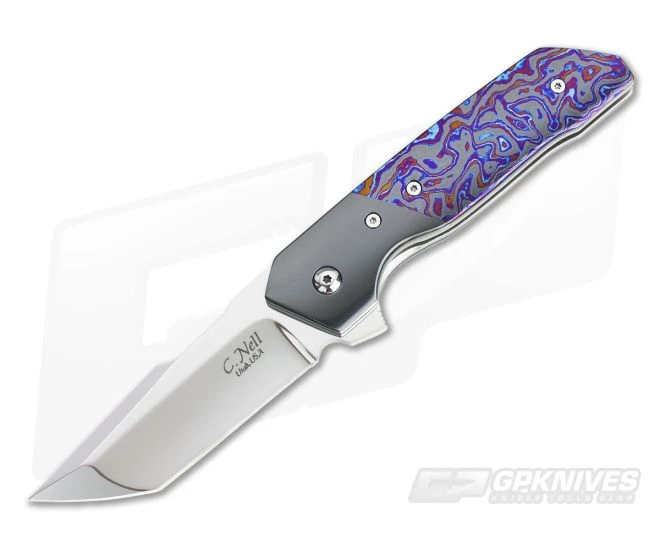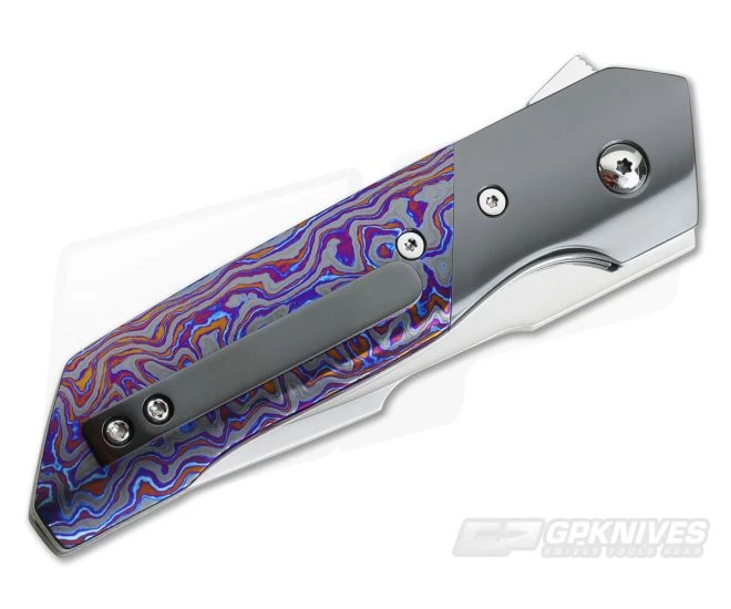 The Handle:Â Liners built with wonderful matte grey titanium gets a light sheer to it via the orange peel method. This finishing adds a most welcomed texturing and appearance throughout. Dark and mysterious Zirconium bolsters accent the insane star of the show…Lava Lamp Black TiMascus scales. They have a bolster-matching background with wildly blue and purple lava flow. The Hardline features polished Torx hardware, Zirconium back spacer and tip up pocket clip.