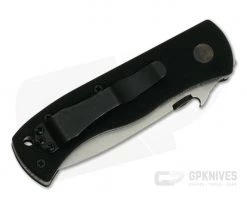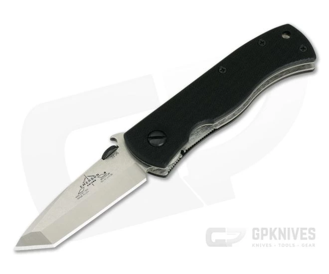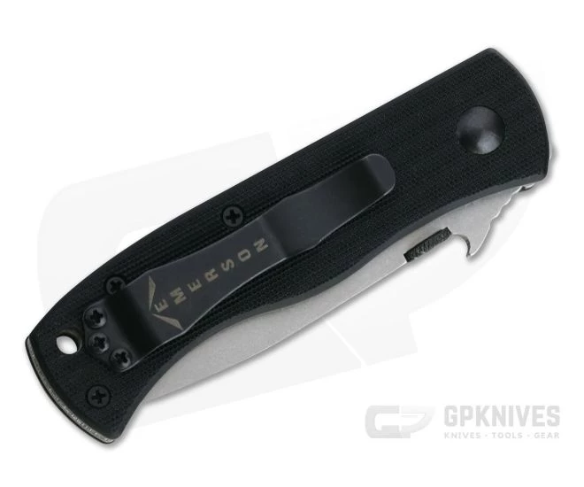 The Handle:Â Emerson knife handles have a “no nonsense” design with durable titanium liners and course, black G10 handle scales that offer superb traction in the hand in the most adverse conditions. One liner forms the locking mechanism that is reliable and easy to operate even in gloves. This version has an open back construction with standoffs for ease of cleaning and maintenance. A generous hole is provided for lanyard attachment and the right hand, tip-up black oxide finished pocket clip provides secure carry.