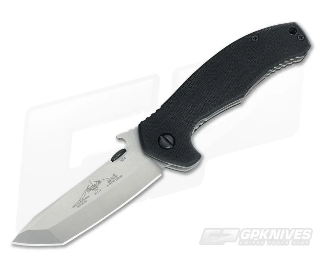 The Emerson Mini Roadhouse is a scaled down version of it’s beast of a brother, the full-sized Roadhouse. Ernest Emerson says if a chopper could be a knife, it would be the Roadhouse, so you know the Mini version is also going to pack a punch. Living up to its name, it begins with a 3.5″ tanto style blade crafted from 154CM stainless steel. It features an Emerson Production V Grind with a stonewashed finish and razor sharp plain edge. This blade is unleashed via its ambidextrous black thumb disc or Emerson wave feature on the top of the blade. Aerospace grade titanium liners and lock keep the blade solidly locked until you decide to let up. No-slip grip black G10 handle scales house this mini beast and make the knife a perfect extension of your hand. Includes a black coated tip-up carry pocket clip. Brand new direct from Emerson Knives.