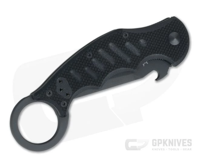 Handle:Â Black coated stainless liners support coarse black G10 handle scales offering superior traction even when wet. Designed to be comfortable and secure in tip-up or down grips, the ring end handle allows for traditional Karambit techniques to be employed along with standard grips. A robust liner lock mechanism delivers smooth operation and secure lockup.