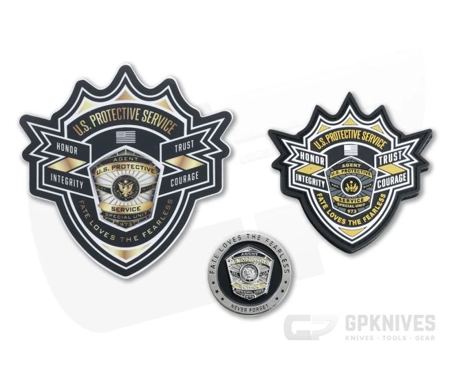 Handle:Â Black hard anodized, aircraft grade aluminum houses the blade and mechanism with subtle finger contours and strategic milling on the sides for a solid, secure grip. The front features a weathered American Flag while the back sports the US Protective Service badge. The construction is completed with black Torx hardware and a hole is provided for lanyard attachment at the pommel end.