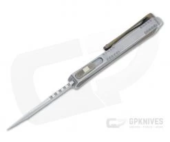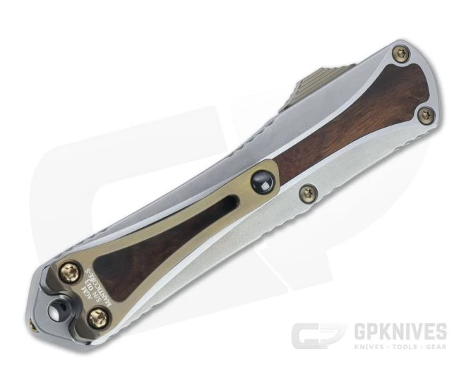 The Heretic Knives Manticore-S is the smallest of the Manticore Series of double action, out-the-front, automatic knives. This very special Hand Ground custom version comes with a stainless steel handle, hand satin flats, desert ironwood inlays and bronze hardware with a hand hollow ground, high polish finished Elmax Tanto blade. S/N 013.