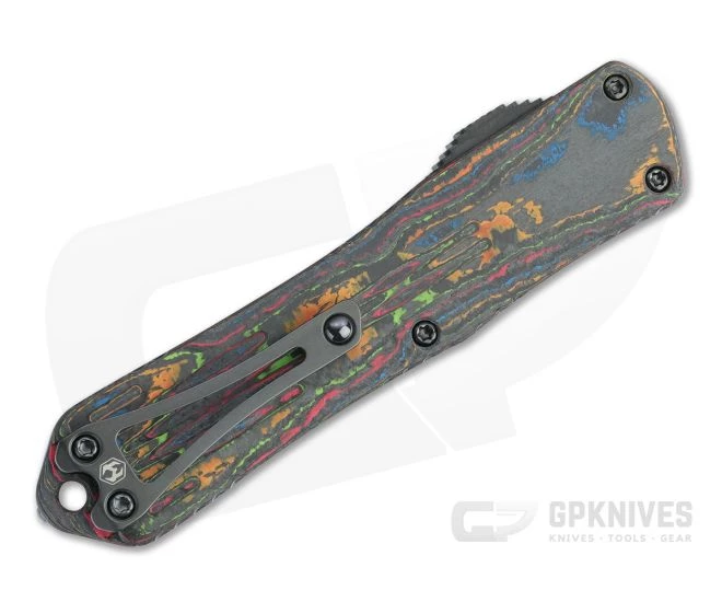 The Manticore-E is a mid-size, double action, out the front, automatic and the Everyday Carry solution in the Manticore line from Heretic Knives. Retaining the same countered, machined aircraft aluminum frame with traction scallops, the Manticore-E offers a secure and comfortable grip with double-action operation and a high performance stainless steel blade. This version comes with a stonewashed black DLC coated Tanto blade, with matching hardware and an ‘Awesome 80s’ camo carbon fiber back cover.