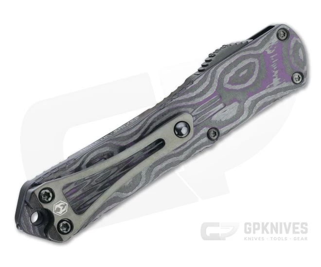 The Heretic Knives Manticore-S is the smallest of the Manticore Series of double action, out the front, automatic knives. The scaled down Manticore-S has the same contoured aircraft grade aluminum handle with traction scallops and fluting for a stylish look, secure grip and compact carry. This Tanto version comes with a stonewash black DLC coated Elmax blade, black frame and black and purple camo (marbled) carbon fiber back cover.