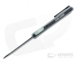 Handle: Milled, black anodized aluminum pairs with lightweight and durable G10 to deliver 5.5 inches of handle, long enough for extra large or gloved hands. G10 offers weight reduction with added visual appeal, contrasting with the black aluminum of the frame. Contoured milling and smooth edges on the handle pair with strategically placed scalloped sections for excellent comfort and traction. The front and back of the handles are sterile with company, model and serial number markings on the spine of the frame. Construction is completed with black Torx hardware visible on the back, integral lanyard hole and hardened steel glass breaker inset in the pommel.