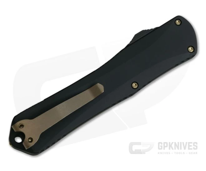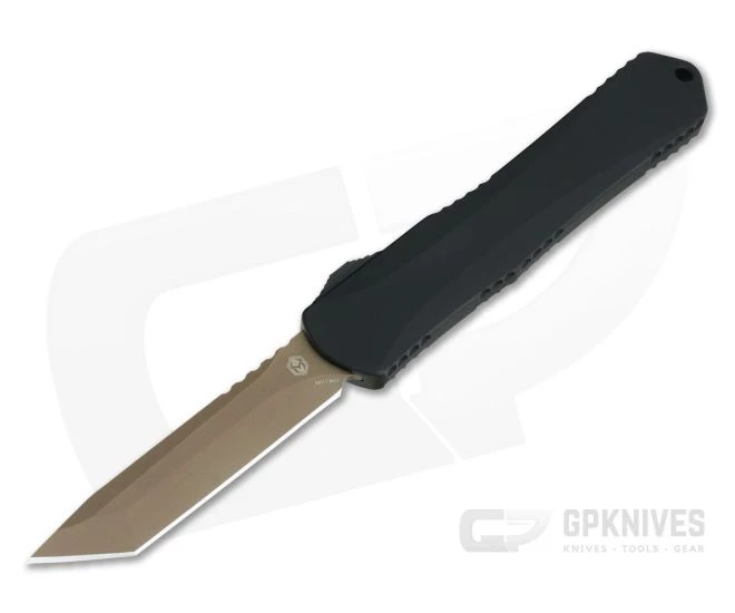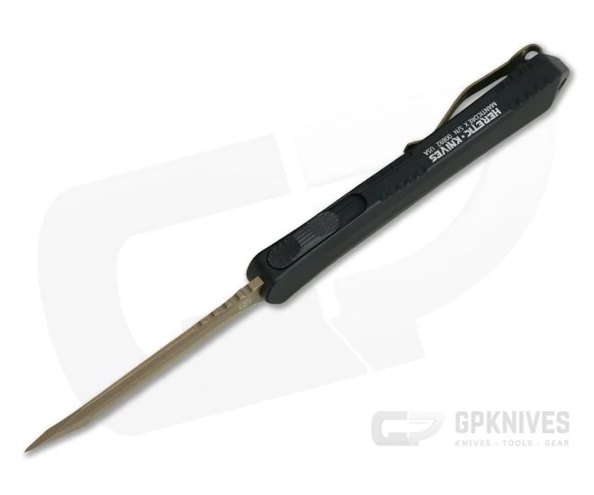 The Heretic Knives Manticore-X is the largest of the Manticore Series of double action, out the front, automatic knives. The Manticore-X has a countered, 3D machined, aircraft grade aluminum handle with strategically placed scallops around the edge that delivers a comfortable and secure grip in the hand. This version comes with a Tanto profile, Battleworn Bronze finished, CPM S35VN blade and black anodized handles.