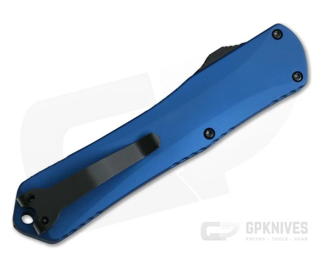The Heretic Knives Manticore-X is the largest of the Manticore Series of double action, out the front, automatic knives. The Manticore-X has a countered, 3D machined, aircraft grade aluminum handle with strategically placed scallops around the edge that delivers a comfortable and secure grip in the hand. This version comes with a full serrated, Tanto profile, CPM S35VN blade with tumbled Black DLC finish, blue anodized handles and black hardware.