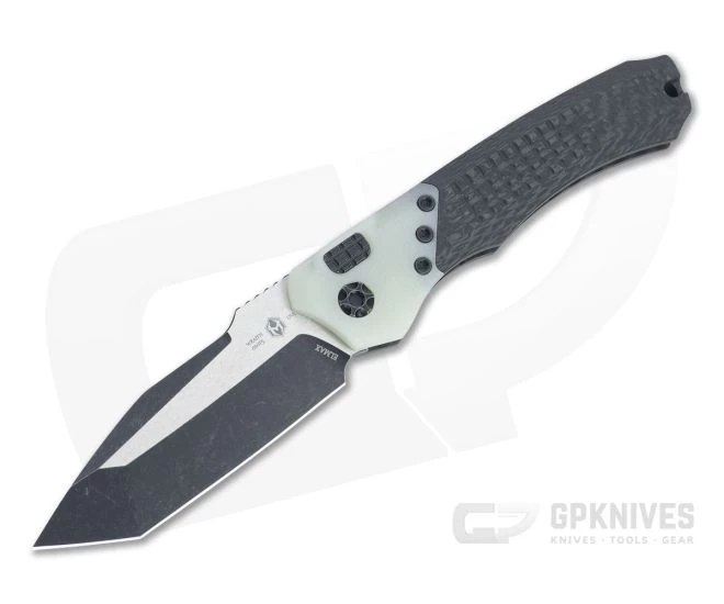 The Wraith Auto from Heretic is a versatile and innovative automatic knife design. Built with an ingenious one piece integral carbon fiber chassis and button lock mechanism, the Wraith is a robust yet lightweight folder with reliably fast deployment. This version comes with a two-tone Battleworn Black Elmax Tanto blade, Jade Green G10 bolster and integral carbon fiber handle.