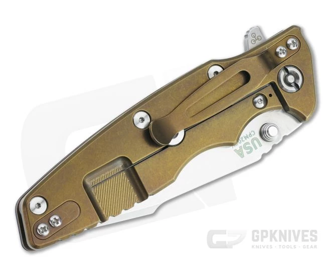 Handle: Rock solid titanium frame lock construction is paired with an ergonomic and streamline design with a comfortable thumb scoop, dual finger grooves and pommel taper combining for a handle that is comfortable and secure in multiple grips. Strategic jimping and a textured layered G10 front scale offer traction while the open back construction makes cleaning and maintenance a breeze. The lock face is equipped with a steel insert for smooth, reliable and secure operation for safe use. Liner and frame have a matching stonewashed bronze finish for a striking look.