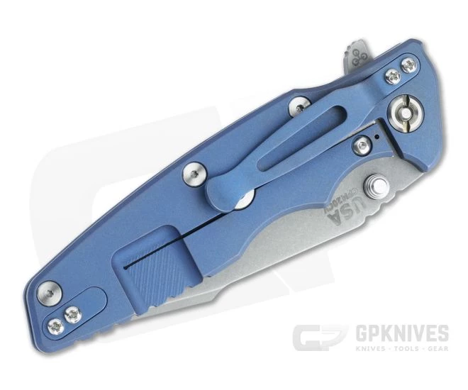 The Hinderer Knives Eklipse is a robust tactical everyday carry folder that offers an ergonomic, streamline handle design that is comfortable for extended use and carry. A +6 mm thick, solid titanium frame paired with the stainless steel lock face equipped titanium frame lock and Hinderer Lock Bar Stabilizer provide a tank like platform capable of handling intense use. The 3.5 Eklipse is comes standard with the innovative Tri-Way pivot system for user customizable operation. This version features a Working Finish 20CV Harpoon Spanto blade, blue G10 scale and Battle Blue frame.
