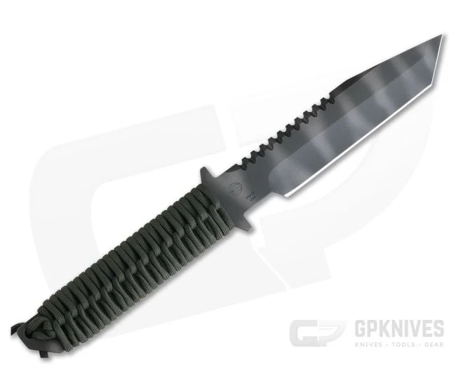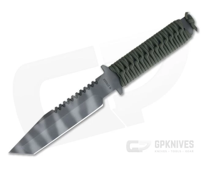 The Blade: Composed of a thick stock of PSF27 tool steel, the blade has been ground to a piercing tanto point style and given a non-reflective TigerStriped finish.  Full tang for overall knife strength, the base of the blade features a block-shaped choil and small guard. Aggressive Spine serrations travel a little over half of the blade for utility tasks that may arise as well. Â