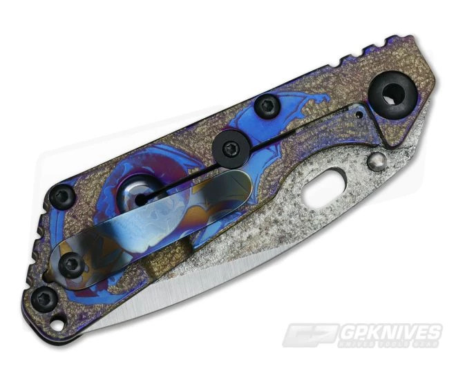 The Strider SnG model is one of his most popular every day carry models and this Mick Strider Custom SnG has the detailed fit and finish to elevate your EDC to the next level. This unique SnG sports a Drop point, Nightmare Grind blade with a Flat, Textured Black integral Aluminum handle scale and ‘Doomsday’ textured, multi-color anodized titanium frame lock with custom “Flying Skull” graphic. Comes complete with a padded nylon zipper pouch with “SnG” rocker patch for carry and storage.