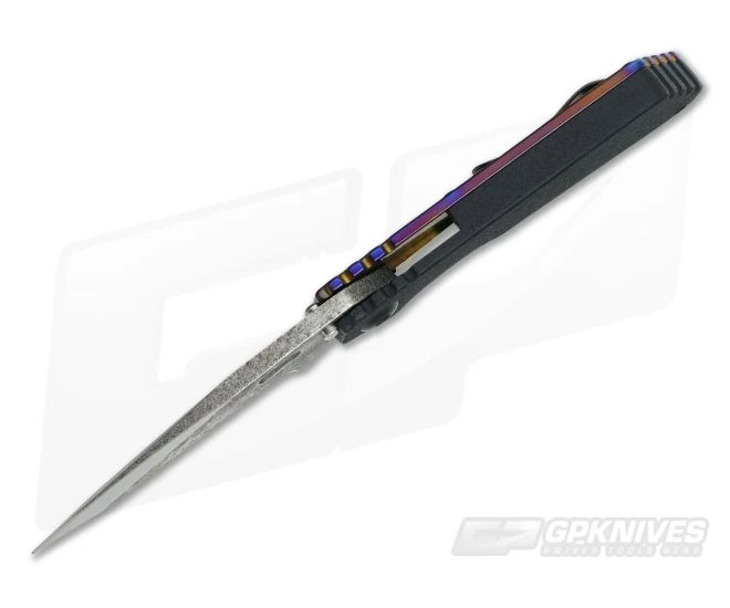 The Handle:Â The front of the handle looks like your standard, Flat or “Lego” scale with integral backspacer for added strength. The scale is made from black anodized aluminum with a textured finish for added traction. The reverse side is a titanium frame lock that delivers rock solid lock up but this custom version comes with a ‘Doomsday’ textured and multi-color anodized finish that complements the blade finish along with a custom, multi-colored custom graphic on both the frame and clip. The MSC SnG is finished out with a titanium pocket clip, black over travel stop and oversize black Torx hardware.