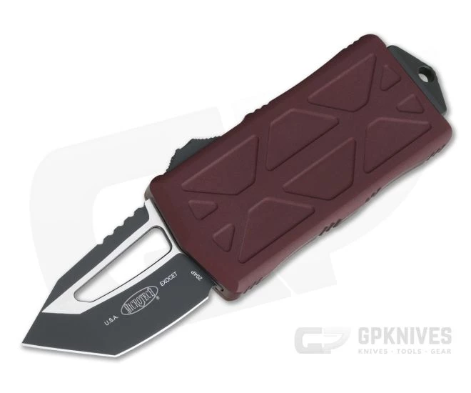 The California Legal Exocet is a dual action mini out the front automatic knife from Microtech that’s one of the most friendly for everyday carry. The diminutive size is perfect for watch pocket or even key ring carry. Not only is it perfect for everyday slicing, but it doubles as a handy money clip. This version has a Merlot hard anodized aluminum handle, black hardware and black coated CTS-204P Tanto blade.