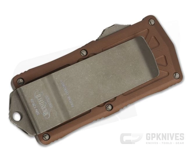 Handle:Â A tan hard anodized 6061-T6 aluminum handle has rounded edges with strategically placed milling creating a comfortable, secure grip and a smooth transition in and out of your pocket. An extra wide “money” pocket clip makes this a prime choice for gentleman’s carry. Construction is completed with Microtech’s Bronze Apocalyptic proprietary hardware, looped hole end knocker and clip with individual serial number/date of production.
