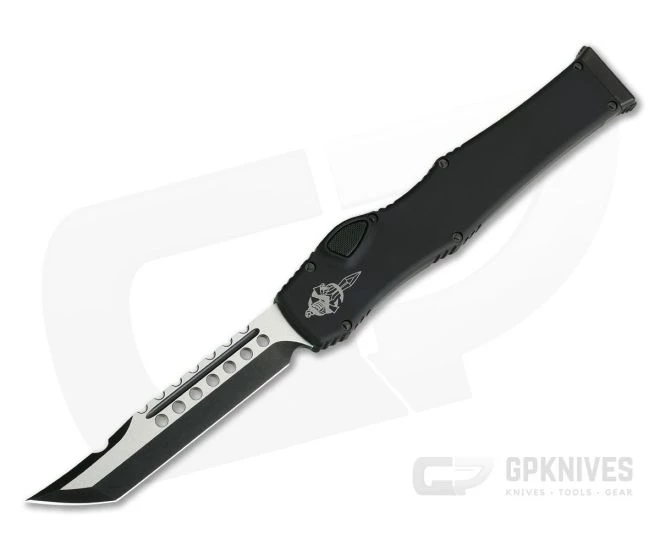 The Halo VI from Microtech is one of those iconic figures in the out the front auto realm. Based on the original Halo, Halo VI is a massive and powerful single action automatic. The Halo VI has undeniably attractive lines but this knife is all business as evidenced by the construction: Premium Bohler Stainless Steel blade and Aircraft grade alloy handles. Upgrades on the VI include a larger, textured firing button and dual latches on the charging handle. This version has no integral safety and the singular Hellhound Tanto blade with a two-tone black DLC Coated finish and DLC Hardware.