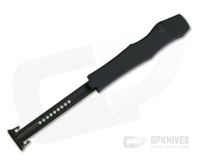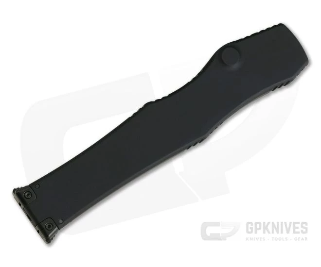 Handle:Â Light and slender for its size, the aircraft alloy handle has been Mil-Spec Anodized Black for a discreet look. Jimping has been strategically placed in several areas around the handle to insure a solid grip on the otherwise smooth alloy surface. An oversize button unlocks the deployed blade and allows the charging handle to be drawn out of the handle. The charging handle is marked with the Microtech logo and production information. Dual latches on the charging handle help to seal the mechanism from external debris. The handle sports The Microtech ‘Talon’ logo & Tactical Black DLC coated proprietary hardware and button to match the blade.