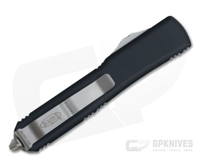 The Ultratech dual action out the front automatic knife from Microtech sets the standard for the category. This version has an Black contoured handle and Tanto-style Apocalyptic finished CTS-204P blade.Â