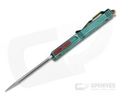 The Ultratech Bounty Hunter dual action out the front automatic knife from Microtech sets the standard for the category. This version has a battle beaten contoured Green handle and a serrated Apocalyptic Tanto blade.