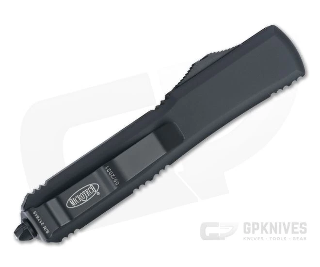 The Ultratech double action out-the-front automatic knife from Microtech sets the standard for the category. With a sleek, rugged design, precision American made construction and premium materials, the Ultratech is a perfect everyday carry companion. This Tactical version has a black anodized aluminum handle with matching hardware and a two-tone black coated M390 Tanto blade with partially serrated edge.