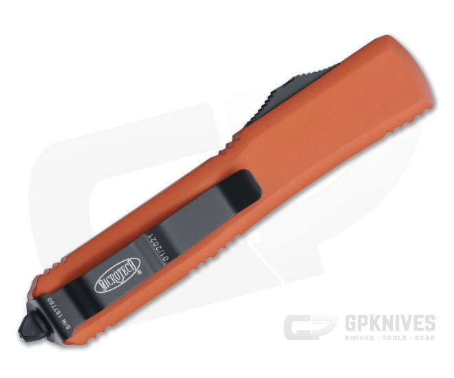 The Ultratech double action out-the-front automatic knife from Microtech sets the standard for the category. With a sleek yet robust design, precision American made construction and premium materials the Ultratech is a perfect everyday carry companion. This version has an orange anodized aluminum handle, black hardware and two-tone black M390 Tanto blade.