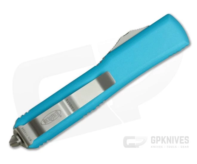 The Ultratech dual action out the front automatic knife from Microtech sets the standard for the category. This version has a Turquoise anodized contoured handle and satin, Tanto-style Elmax blade.Â