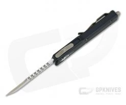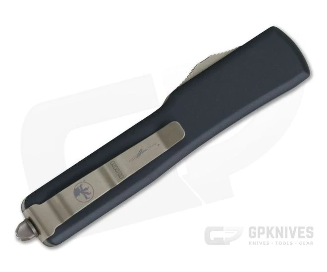 The Microtech UTX-70 is 70% of the size of the standard Ultratech making this double action auto ideal for everyday carry. This Signature Series version has a black contoured handle and a two-tone Bronzed Hellhound Tanto blade.