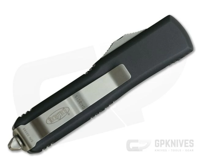The UTX-85 (15% smaller than an Ultratech or 85% the size of one) dual action out the front automatic knife from Microtech makes an even friendlier every day carry option. This version has a Black contoured handle and a plain edge, Apocalyptic finish CTS-204P, Tanto profile blade.Â