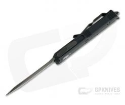 The UTX-85 (15% smaller than an Ultratech or 85% the size of one) dual action out the front automatic knife from Microtech makes an even friendlier every day carry option. This Tactical version has a black contoured handle and a plain edge, black DLC coated, CTS-204P Tanto blade with matching black DLC hardware.