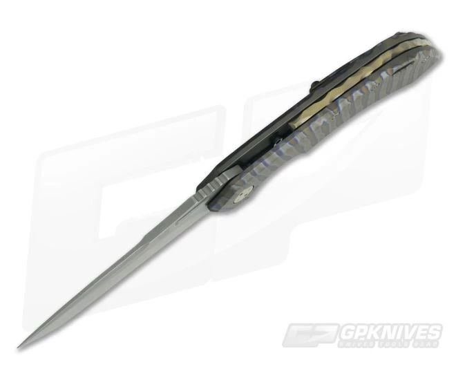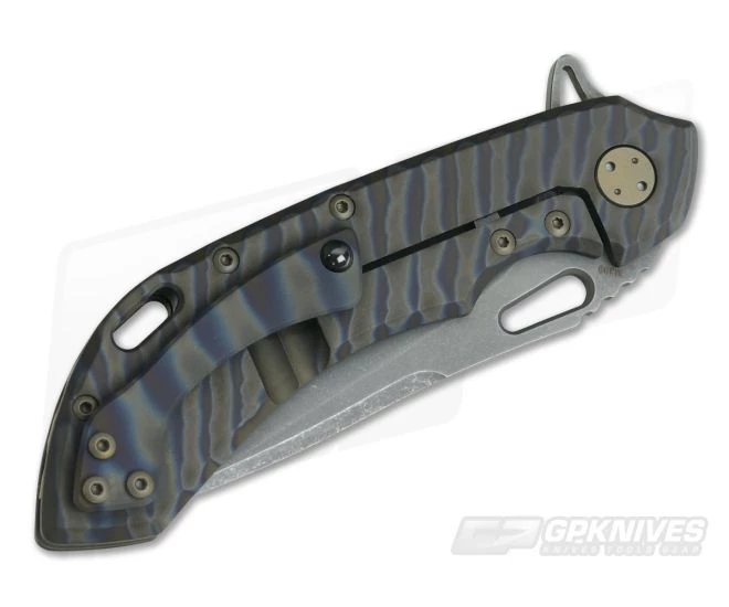 Handle:Â The ergonomic handle design locks the knife into the hand for secure use and all the edges are contoured to reduce hot spots. The frame is bead blasted and flame anodized finish that is subtle, non-reflective and unique. The titanium frame lock has a steel lock face insert that holds the ceramic detent ball and has a tab that doubles as an over-travel stop. A bronze anodized, “Rocks” textured floating titanium backspacer has “WAYFARER 247T” and the serial number “T035T” on the inside. A nice lanyard hole cutout is included on the back of the handle along with bronze anodized titanium hardware matching the backspacer.
