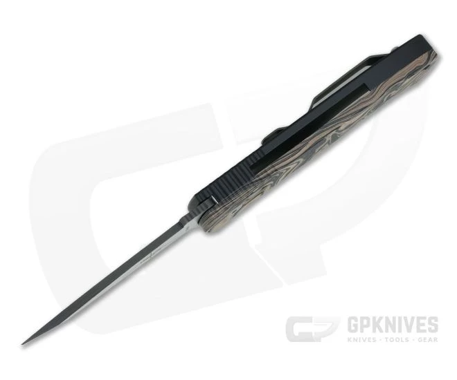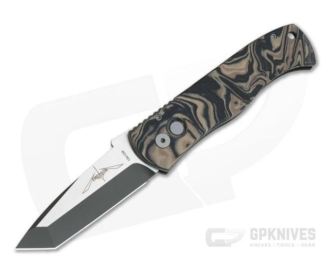 This snappy collaboration between Emerson and Protech Knives is lightweight, tactical, intimidating and just plain cool. Protech executes the classic CQC-7 is their typically flawless automatic construction. This version features a stylish, high performance Camo burled black/brown G10 front scale, thicker 7075 black anodized aluminum backside with integral partial back spacer and a chisel ground, Two-Tone DLC 154CM blade.