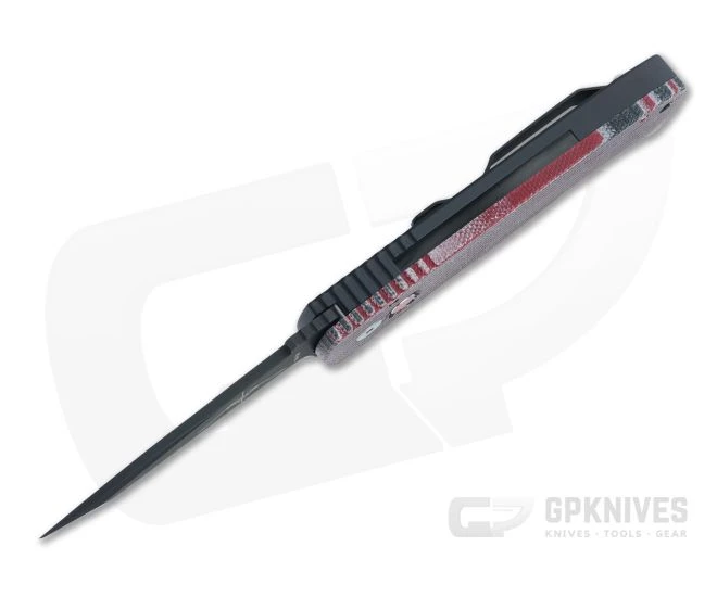 Emerson Knives has teamed up with Protech to offer a high quality production automatic version of the Emerson CQC-7, an American made automatic with quality design and high-tech production in an affordable platform. The fame is made from black hard anodized 7075 aluminum for lightweight durability while the blade is 154CM stainless steel for great all-around performance. This is a high quality collaboration that brings the best elements of Emerson design and Protech manufacturing to a single knife. This version features a black DLC Tanto blade, custom Americana (red, white and blue) crosscut G-Carta top and red G10 button inlay. Note: Direct from Blade Show 2021, includes drawstring bag only. No box.