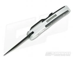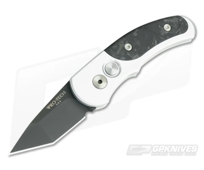 The Protech Knives Runt J4 5400-M is the newest California Legal automatic knife to join the Protech family. This is a high performance Gentleman’s automatic that carries like a feather and performs like a razor while still being stout and durable enough for serious use. The Runt J4 is built with modern American materials, high tech manufacturing, advanced coil spring mechanism, and American production quality that Protech prides itself on. This variant is equipped with a DLC coated, plain edge, chisel ground Tanto blade made from 154CM and Brushed silver aluminum handles with Marbled Carbon Fiber inlays.
