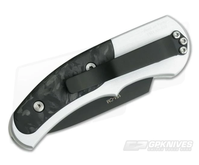 Handle:Â The robust handle is made of 6061-T6 Anodized aluminum that has been satin finished on the flats and tumbled on the edges for classy look. The small handle keeps the knife compact and lightweight while providing plenty of grip for secure use with elegant Marbled Carbon Fiber inlays for added style and weight reduction. A subtle choil and tapered end make for a comfortable grip. A true Gentleman’s knife that disappears in the pocket, the Runt J4 is as at home in jeans as it is in dress pants.