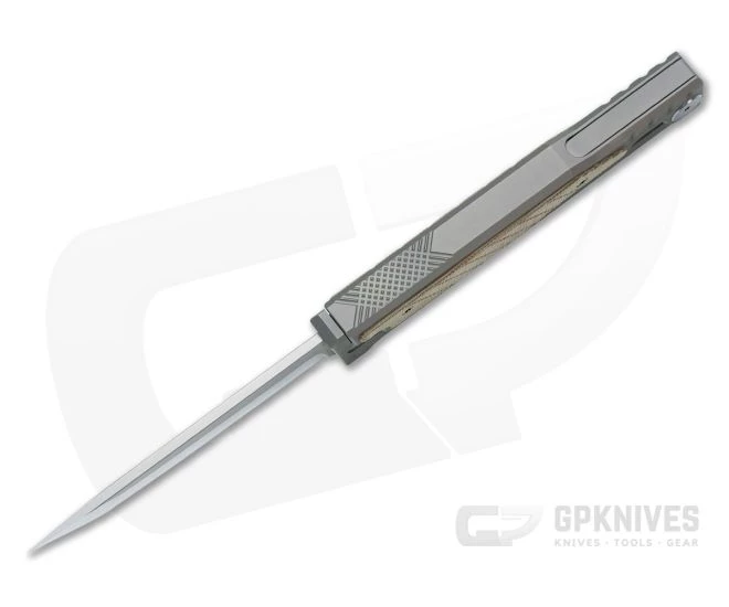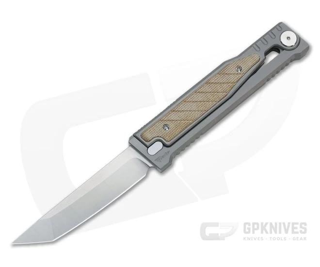 The Exoskeleton Design Reate EXO is a simple and ingenious manual out-the-front knife. Essentially a three-piece construction, the EXO consists of a blasted gray titanium frame, matching Micarta inlaid yoke and the two-tone Elmax blade. Operation is simple: hold the yoke in a pinch grip and let the frame drop. The blade slides freely in its track in the frame, tip the handle down to deploy and up to retract. Hold the frame and yoke together to secure the blade pin for use or carry. This version has a single edge Tanto point blade and brown canvas Micarta inlays.