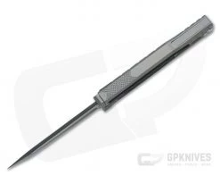 The Exoskeleton Design Reate EXO is a simple and ingenious manual out-the-front knife. Essentially a three-piece construction, the EXO consists of a blasted gray titanium frame, matching G10 inlaid yoke and the two-tone Elmax blade. Operation is simple: hold the yoke in a pinch grip and let the frame drop. The blade slides freely in its track in the frame, tip the handle down to deploy and up to retract. Hold the frame and yoke together to secure the blade pin for use or carry. This version has a single edge Tanto point blade with two-tone black PVD finish and black G10 inlays.