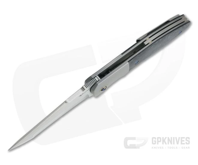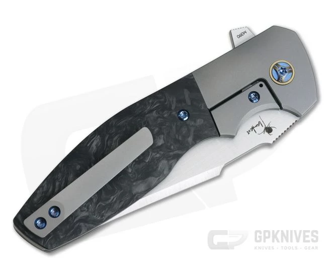 Handle:Â Contoured and fine media blasted titanium forms the foundation of the Augustus including the integral bolsters that provide a nice contrast to the striking Marbled Carbon Fiber overlays. The rear bolster/liner forms the lock which is equipped with a hardened steel insert for smooth, reliable operation for the life of the knife. A floating titanium backspacer is fit on bronze anodized pillars. The knife is finished with custom anodized titanium hardware for a truly custom field.