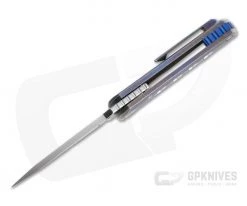 Handle:Â Built of two thick, contoured slabs of 6Al4v titanium, both the front and back of the handle are brushed satin matching the blade with an anodized finish. Contoured edges and an ergonomic design combine for a comfortable and secure in-hand feel. Milled with four holes for traction and weight reduction, the front scale is backed by a steel mesh for a custom look and feel. The titanium frame lock is equipped with a hardened D2 tool steel insert that provides smooth and reliable lock operation as well as being an over travel stop. A milled titanium back spacer is anodized blue for a pop of color. A custom pivot is textured for a unique look while the remaining hardware is satin finished.