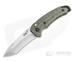 Built in collaboration with world-class Japanese tactical knife designer and custom maker Kiku Matsuda, the SOG Kiku Assisted has Matsuda’s unique and striking style paired with SOG production build quality to deliver a functional, tactical folding knife you can count on. Ultra-fast SAT spring-assisted operation deploys the premium S35VN stainless steel blade at a touch. Both blade and handle showcase Matsuda’s trademark design elements with a compound ground Tanto profile and milled, scalloped texture respectively. Full length stainless steel liners form a robust foundation with a simple, reliable button lock mechanism providing rock solid and secure operation. This version comes with linen Micarta handle scales over black liners and a satin finished blade.