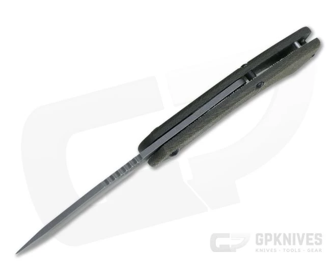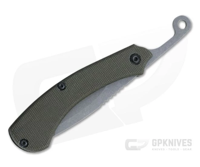 Handle:Â Two slabs of Green Canvas Micarta are held in place by three black coated Torx screws for a secure, easy to maintain, open back construction. Contoured edges make for a comfortable grip while the rugged material provides traction even when wet as well as being durable and weather resistant.