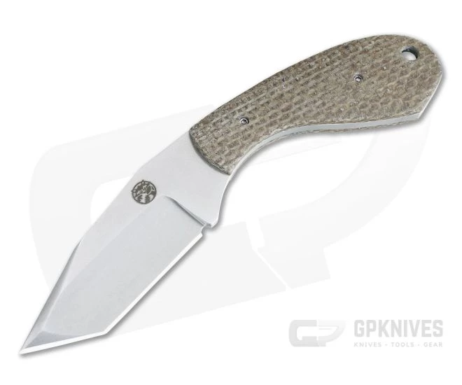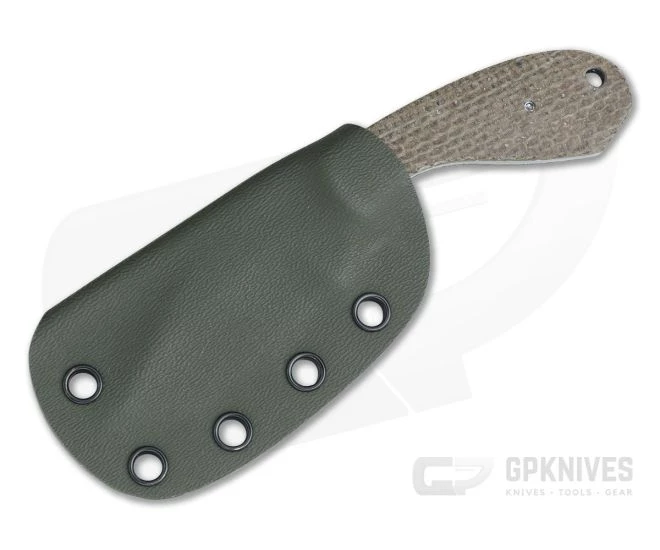 Handle:Â The full tang blade supports a rugged, blasted Burlap Micarta handle scales. The handles are canted downward from the blade delivering a secure, three-finger “pistol” grip. A large hole is provided for lanyard attachment.