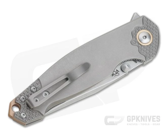 Blade:Â Made from 4 mm thick Bohler M390, the modified Tanto blade offers a solid balance of cutting performance and durability. Deploying fast and smooth on stainless steel thrust bearings, the blade can be operated with the index flipper tab or dual thumb studs. A high saber grind slices well while the clip point swedge and Tanto point provide exceptional piercing power and good control for detail work. A crowned spine offers a high-class look complementing the matte gray titanium scales while the rugged stonewashed finish hides wear from use.